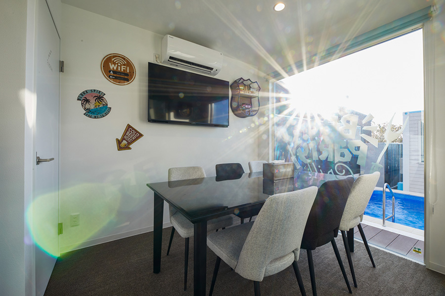 敷地全体を1棟に使用したプライベートリゾート空間。ファミリー、グループで別荘感覚に気兼ねなくご滞在いただける定員6名(添い寝は4名まで無料)、1棟料金/ルームチャージ制なので、ご利用人数が増えるほどお得に。プライベートな空間で淡路島の滞在をお楽しみください。